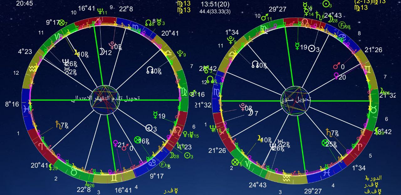 بالنسبة لي فقد احترت ايضا بين الاثنين فرغم اني اتبنى المنهج المداري تماما الا اني لاحظت تطابق غريب مع الاحداث ان استخدمت الخارطة المصححة فمثلا اعتبر سنه ٢٠٠٦ اهم سنة بحياتي حينما سافرت من العراق لاول مرة ونرى بالخارطة المصححة اشارة واضحة لهذا السفر لان طالع التحويل هو نفسه البيت التاسع بخارطة المولد