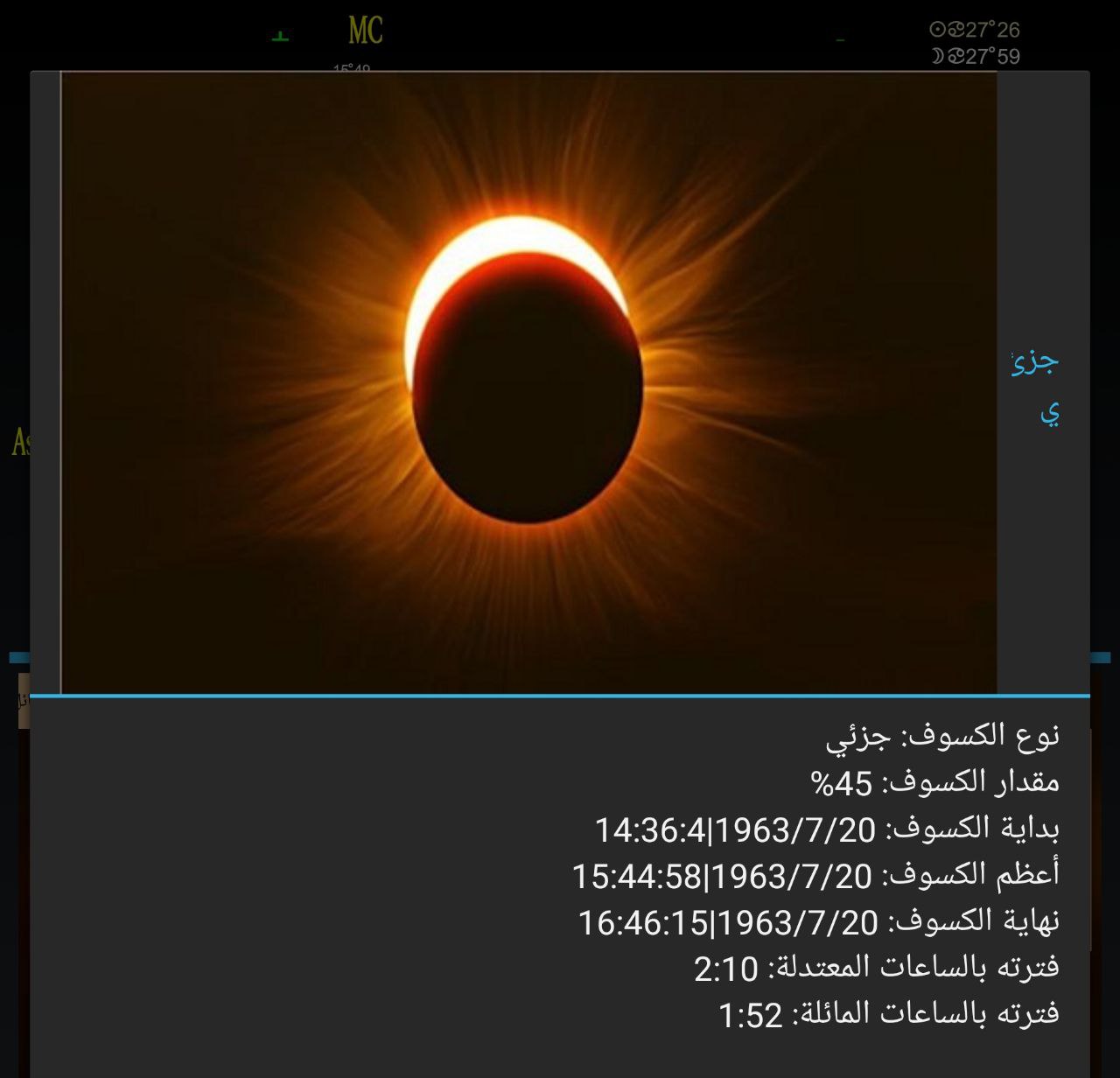 فمثلا بتحويل جاكلين كينيدي السابق نلاحظ ان كسوف جزئي للشمس حصل في ٢٠ تموز بتلك السنة كان مرئي في الولايات المتحدة
