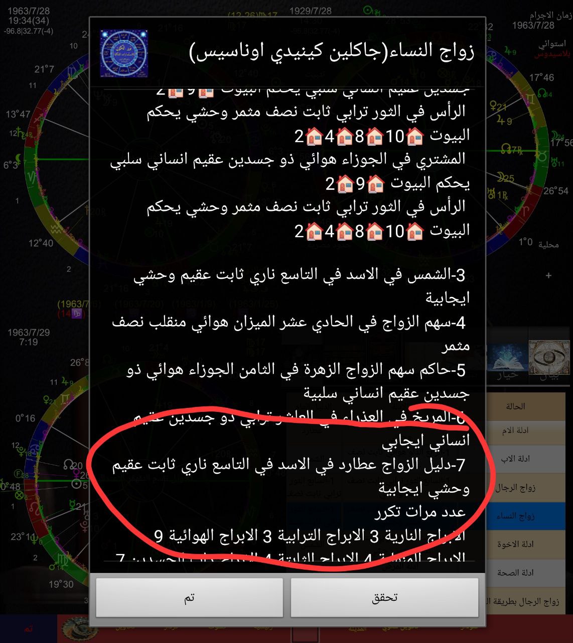 وكان في الدرجة ٢٧ سرطان اي مقارن لدرجة السابع بتحويل جاكلين الغير مصحح ( الاعتيادي) وايضا نرى ان مطرح تربيع المريخ وصل لطالعها قبل الحادث بشهرين.