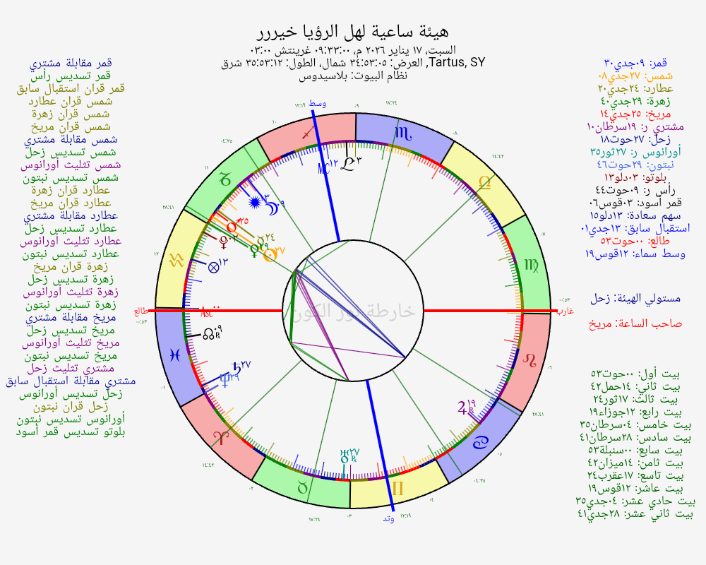 ⊕ تسديس زحل: تناغم وفرص سهلة. تعاون مثمر بين الدلالتين.