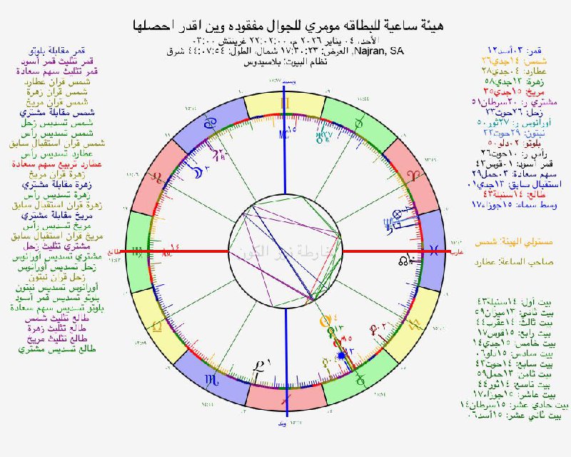 • درجة الطالع: 14° 43'• برج الطالع: العذراء• حاكم الطالع (الدليل الأول للسائل): عطارد - موقعه: 4° 28' في برج الجدي - البيت: الرابع (الأساس)