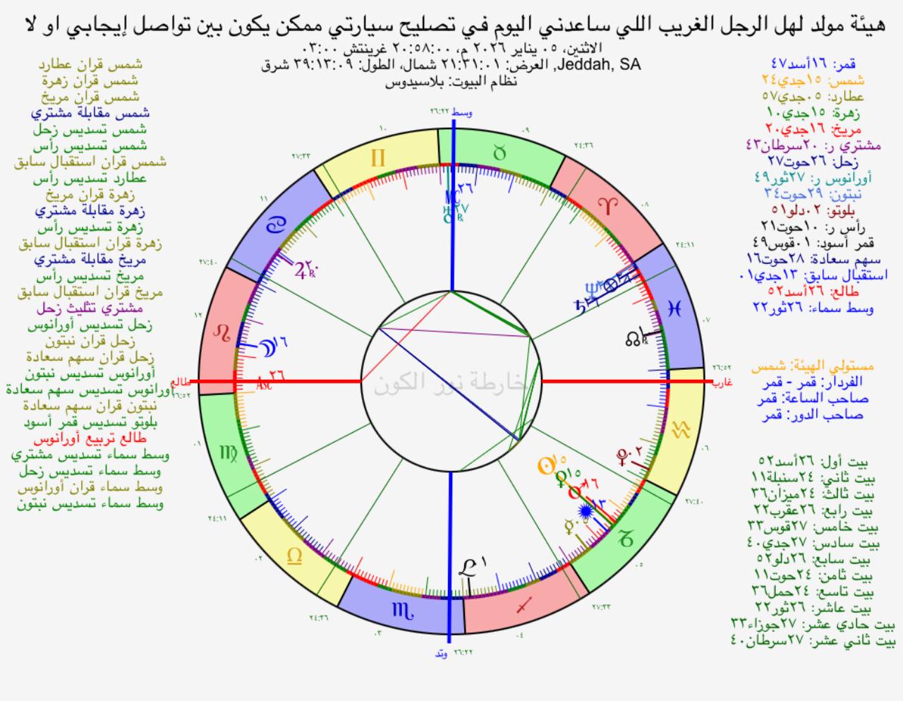 تبدأ القراءة الفلكية بتقييم أصالة المسألة التي سجلت درجة توافق 67%، وتتأسس الخارطة على طالع في 26° 52' من برج الأسد وبيت المسؤول عنه (البيت 7) في 26° 52' من برج الدلو. يمثل السائل في هذه القضية دليله الشمس الذي يقع في 15° 24' من برج الجدي، بينما يمثل الطرف الآخر دليله زحل الذي يقع في 26° 27' من برج الحوت. المفتاح الأول لكشف النية هو موقع دليل الشخص المسؤول عنه (زحل)، حيث أن وجوده في البيت 8 من خارطتك يوجه تركيزه واهتمامه نحو دلالة هذا البيت، وهي: 'ماله الخاص أو ممتلكاته'. أما عن مشاعره تجاهك، فيظهر وجود قبول فلكي بين دليله ودليلك، وهو شاهد على وجود نية إيجابية أو ود. وتكشف حركته المستقبلية عن نيته للفعل، حيث أن اتصاله المقبل سيكون باتصال sextile مع كوكب أورانوس، وهذا يصف طبيعة خطوته القادمة.