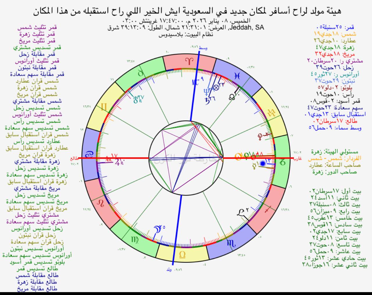• حالاته الخاصة: الإقبال: المشتري في وتد (البيت 1) مما يقوي دلالته.، الولاية: المشتري في شرفه (السرطان).، الحظ: المشتري في وتد وفي أحد حظوظه.، الانحلال: المشتري خارج حيزه الطبيعي..