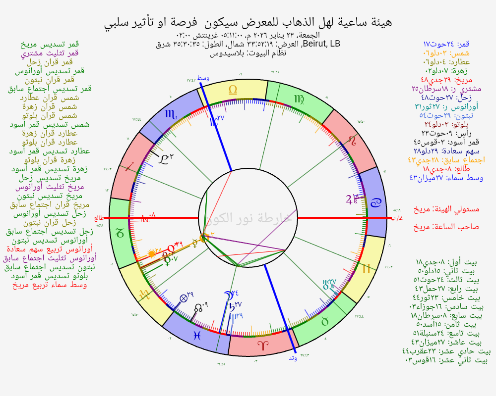 - حظوظه العرضية (مجموع: -3): حاله وموقعه يكتسب حظوظه من كونه: في بيت زائل (-5)، مستقيم وسريع الحركة (+4).