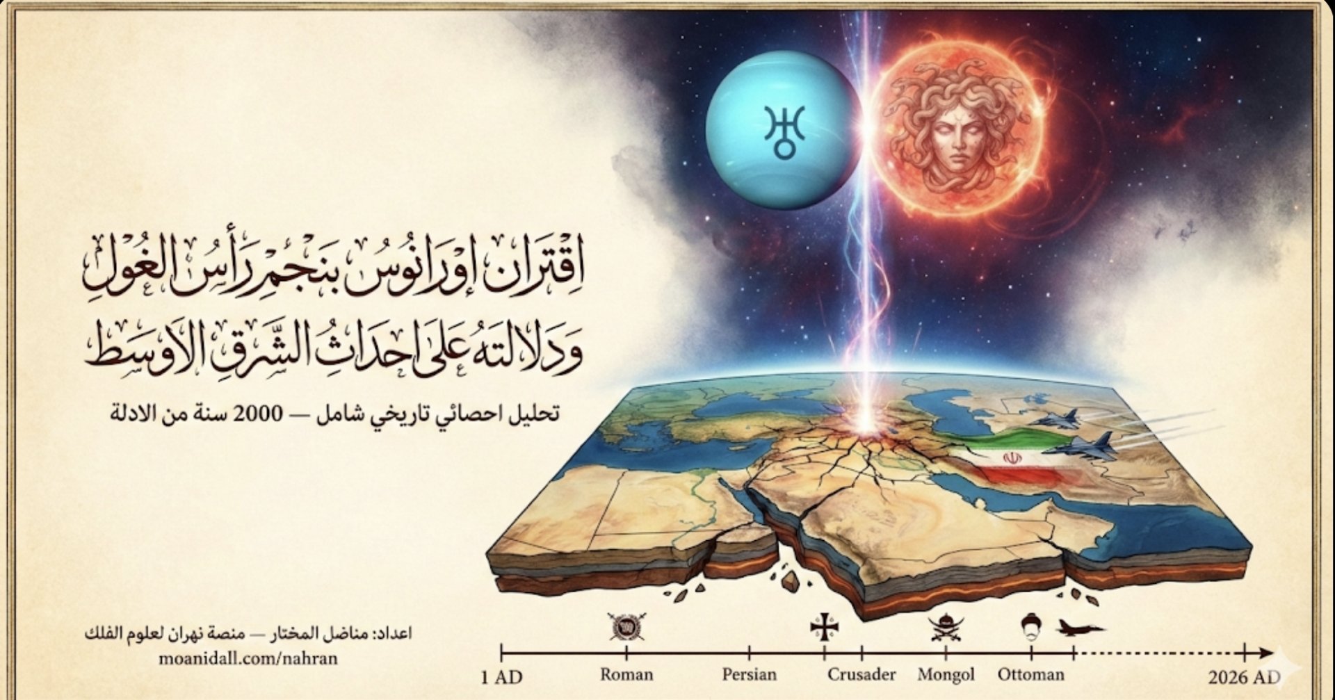 هذا يعني ان كل فترة اقترن فيها اورانوس بنجم رأس الغول على مدار 2000 سنة تزامنت مع حدث كبير في الشرق الاوسط. النمط ثابت ومتكرر عبر جميع الحقب التاريخية بغض النظر عن الامبراطوريات الحاكمة او الظروف السياسية.