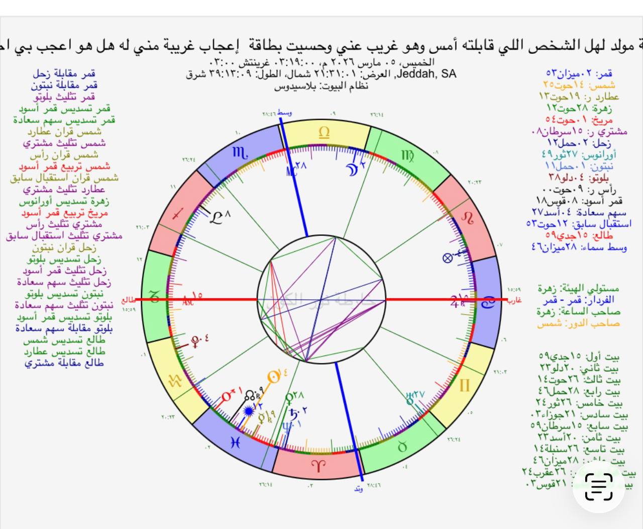 • القمر: 2° 53' من برج الميزان - مرآة المشاعر والأفكار الذو جسدينة